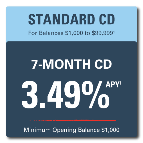 1APY = Annual Percentage Yield as of 12/15/2025 and subject to change until CD is opened. $1,000 minimum balance required to open Standard CD. $100,000 minimum required to open Jumbo CD. Interest is compounded and paid quarterly and at maturity. Once opened, the CD rate will not change until maturity. Fees may reduce earnings. Penalty for early withdrawal.