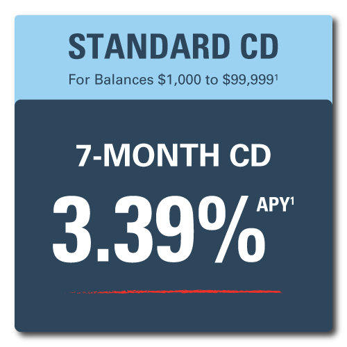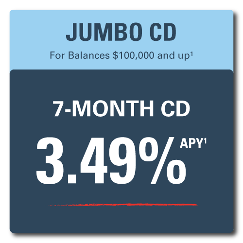 1APY = Annual Percentage Yield as of 12/15/2025 and subject to change until CD is opened. $1,000 minimum balance required to open Standard CD. $100,000 minimum required to open Jumbo CD. Interest is compounded and paid quarterly and at maturity. Once opened, the CD rate will not change until maturity. Fees may reduce earnings. Penalty for early withdrawal.